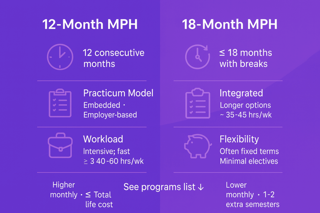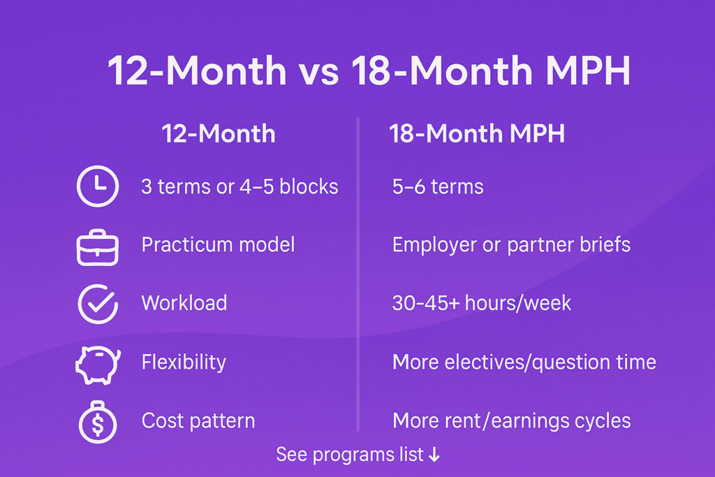 Bottom line: A one-year MPH is the same degree delivered on a condensed calendar. You’re trading elective breadth and schedule flexibility for speed to impact—great for prepared, focused applicants who plan their practicum early and manage time like a pro.