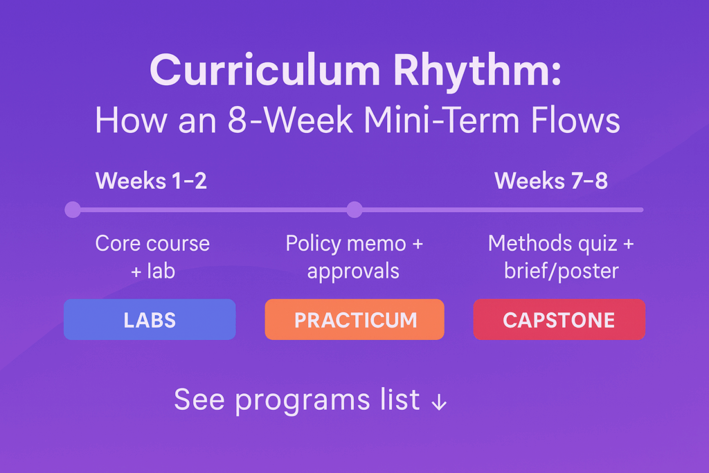 • Weeks 7–8: Methods quiz; submit poster or brief; revise capstone outline.