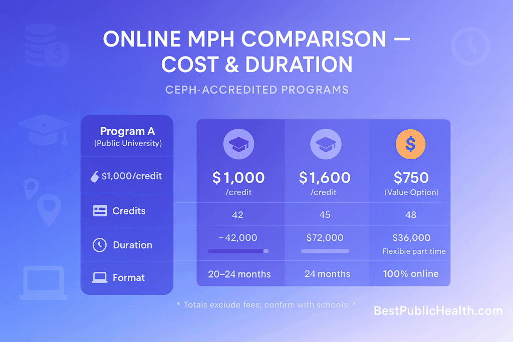 - Florida A&M (FAMU) Online MPH – frequently among the most budget-friendly accredited options.