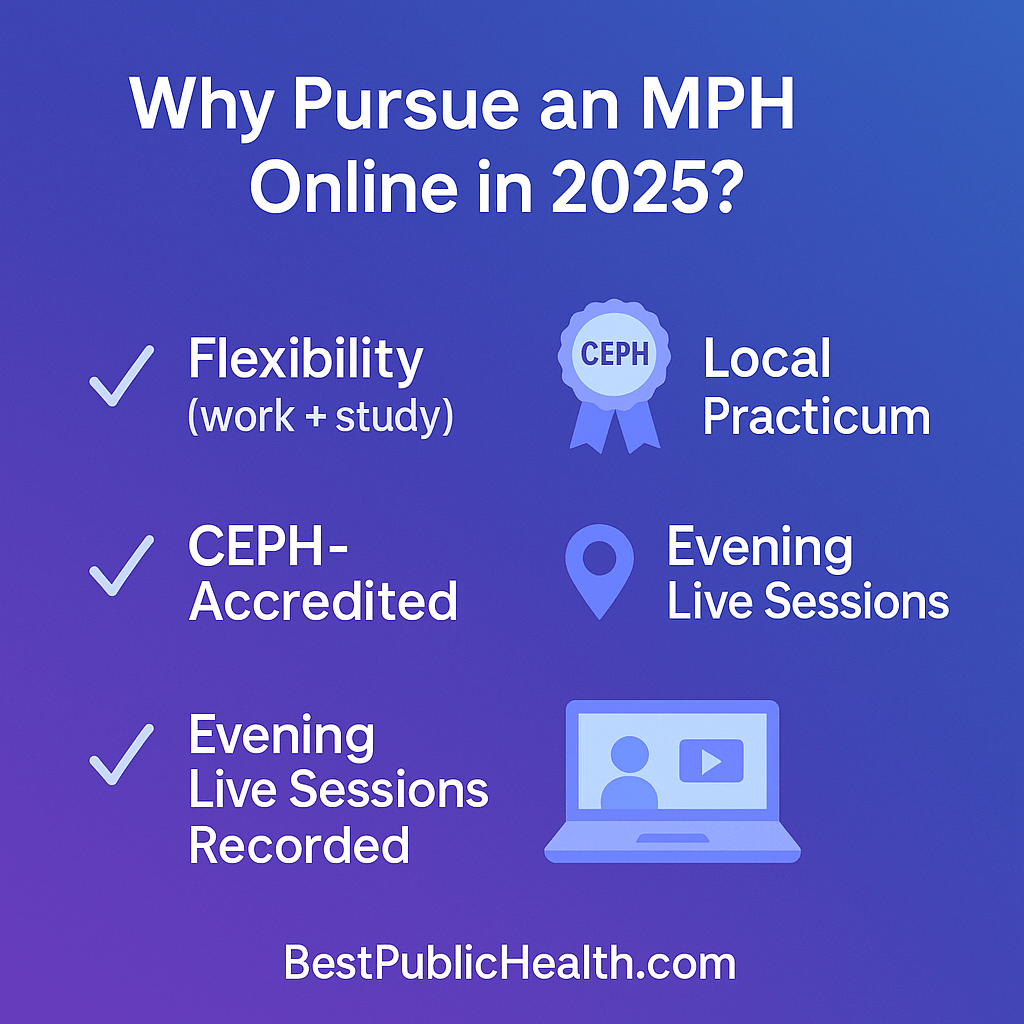 Bottom line: an online, CEPH-accredited MPH lets you keep your life in place while you gain the tools to lead—no commute, no relocation, and no compromise on rigor.