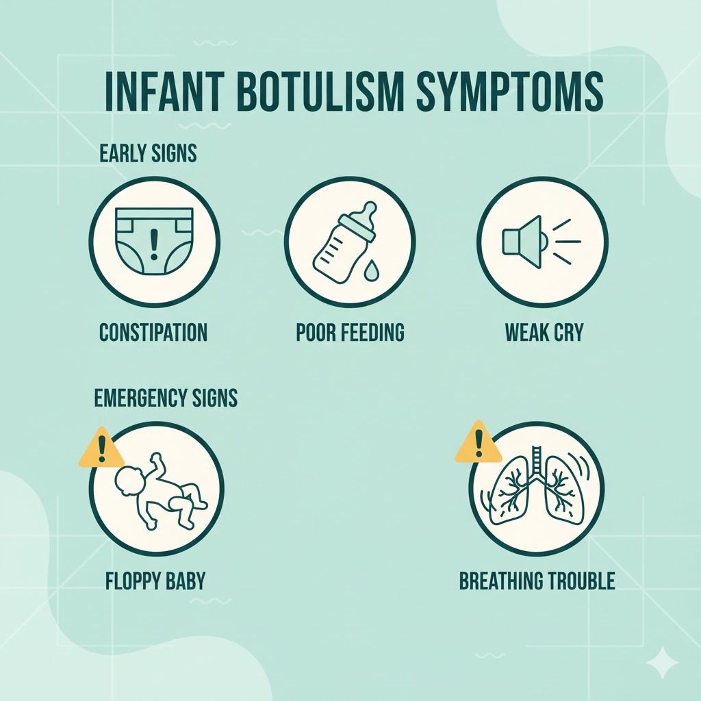 You don’t need panic, but you are not automatically “safe” either. Infant botulism symptoms can appear days to several weeks after exposure.